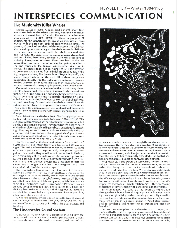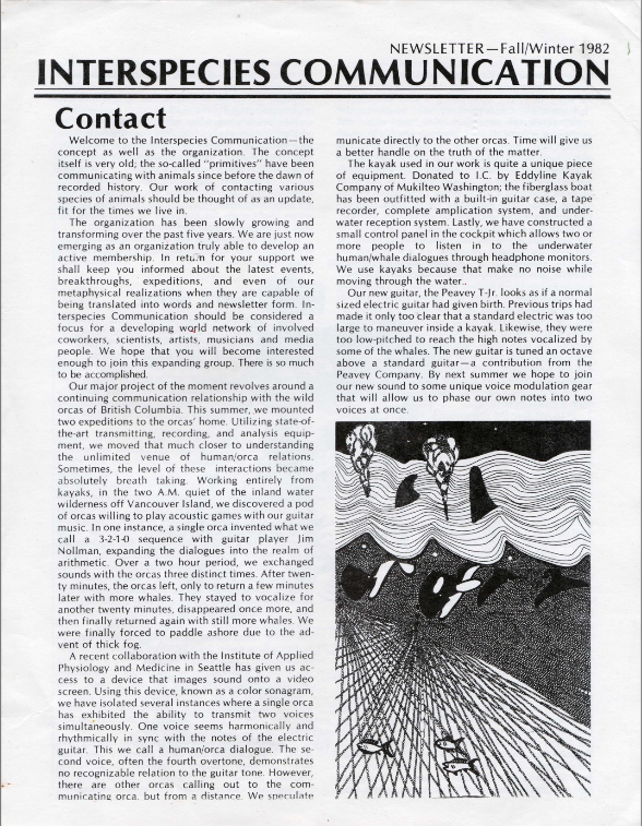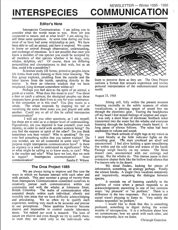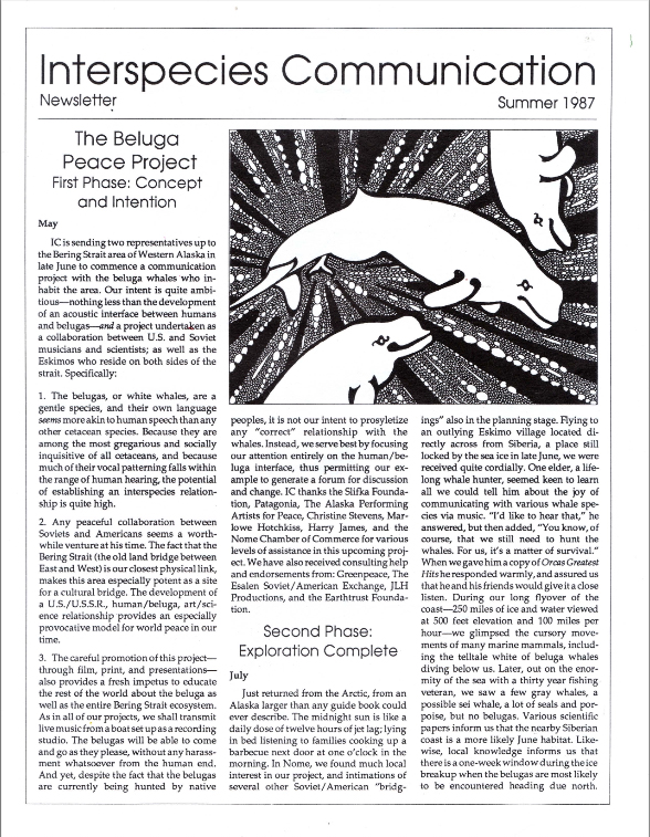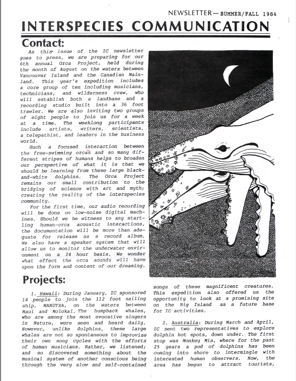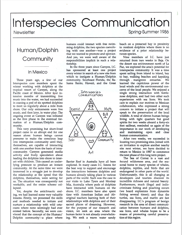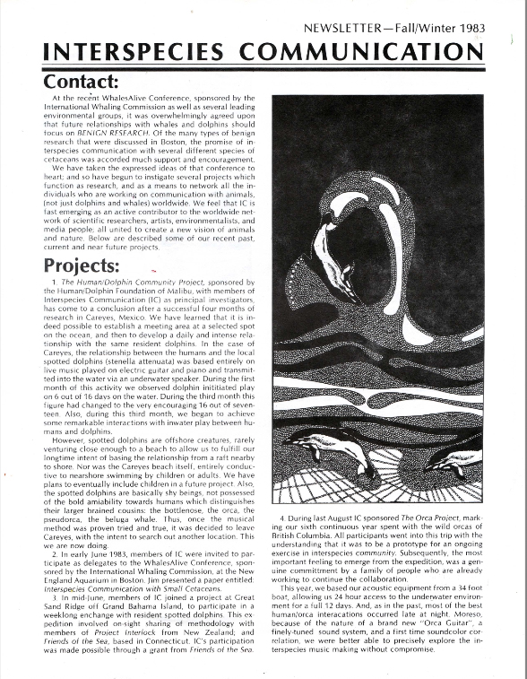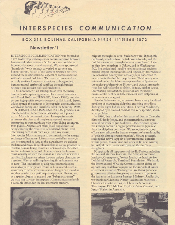 The Interspecies Communication newsletter was published quarterly for over 25 years. Many articles were later expanded and published as books, including The Man Who Talked to Whales, Spiritual Ecology, Why We Garden, and The Beluga Cafe, among others. Other articles about the development of a true interspecies music have appeared in numerous published anthologies and publications internationally.